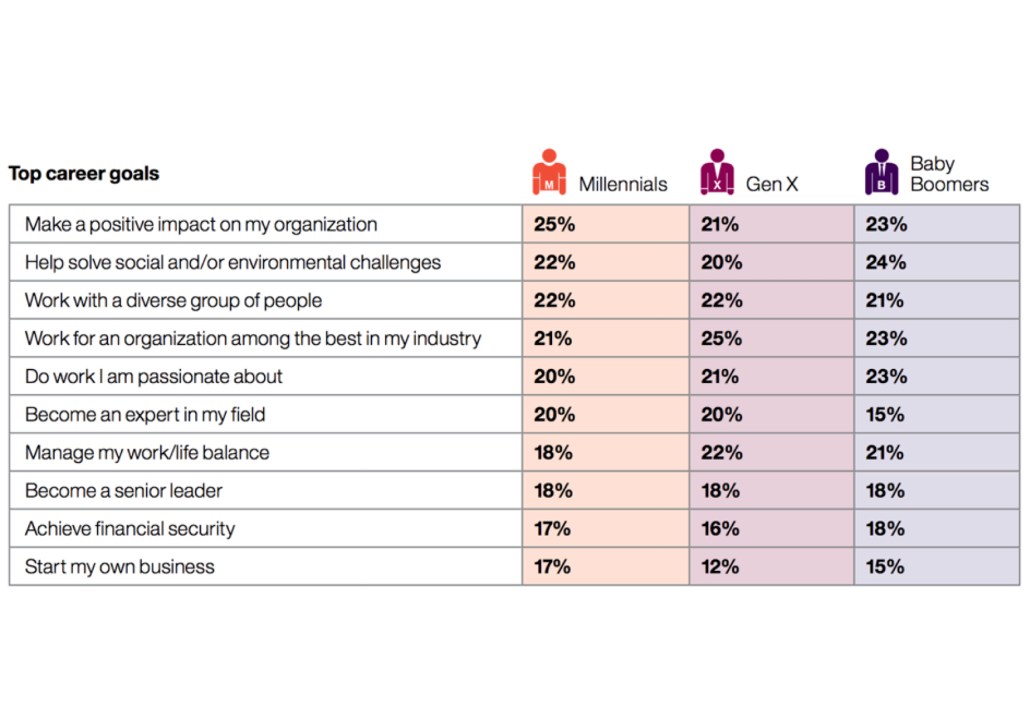 - A report from IBM’s Institute for Business Value suggests the career goals of millennials seem to be remarkably similar compared to those of Gen X and the Baby Boomers.