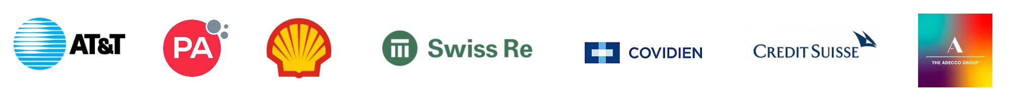 Zu den Organisationen, für und mit denen ich gearbeitet habe, gehören AT&T, PA Consulting Group, Shell, Swiss Re, Covidien (Medtronic), Credit Suisse, The Global Fund und The Adecco Group.